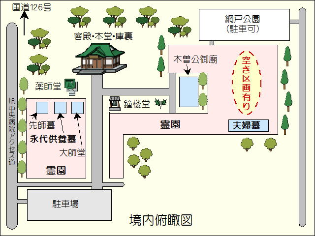 主に空いている境内墓地は木曽公御廟の東側にあります。区画には主に2種類あり、他にも標識のない区画は空いております。ご案内しますのでどうぞお問い合わせ下さい。1) 通常区画:6尺×6尺 (1.8m x 1.8m)・・・永代使用料:40万円